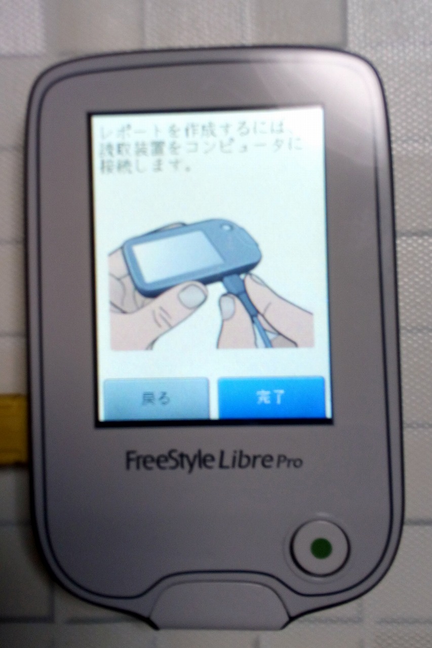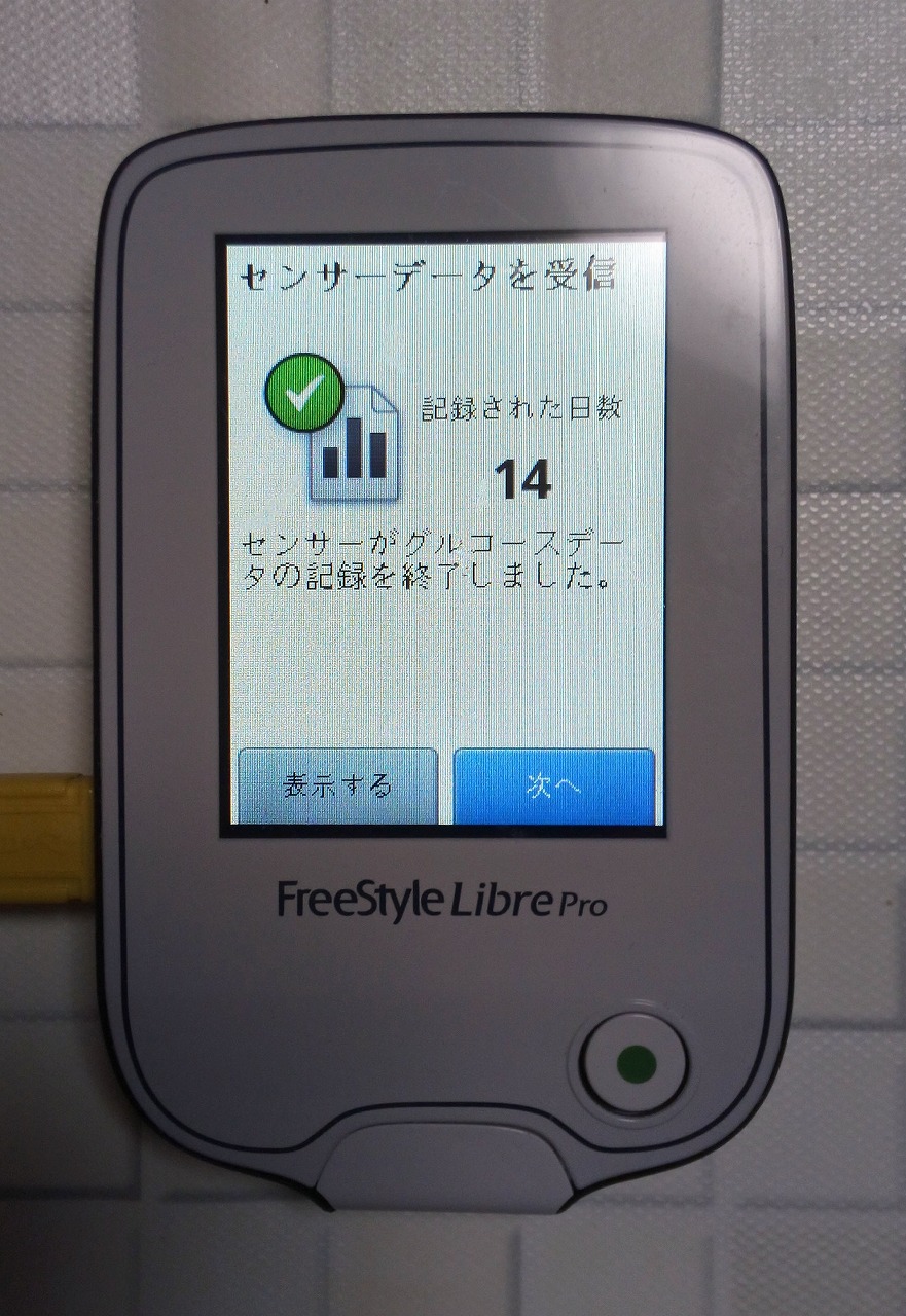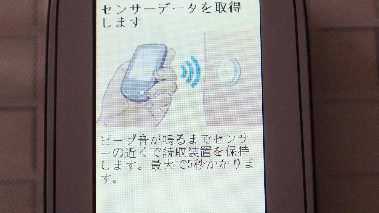 機器がセンサーデーターを取得し終えると「センサーがグルコースデーターの取得を終了しました」と表示される。