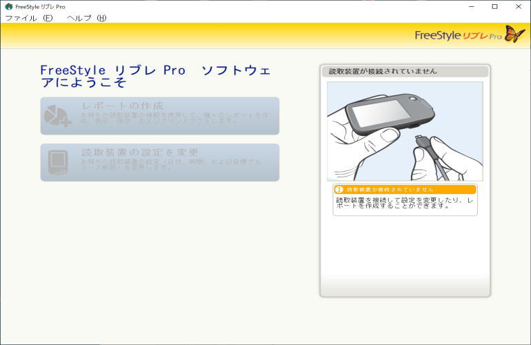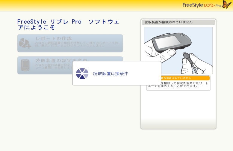 USBで機器を繋ぐと図のように「接続中」の表示が出てから機器が接続され、レポートの作成や読み取り装置の設定を行うことができるよになる。