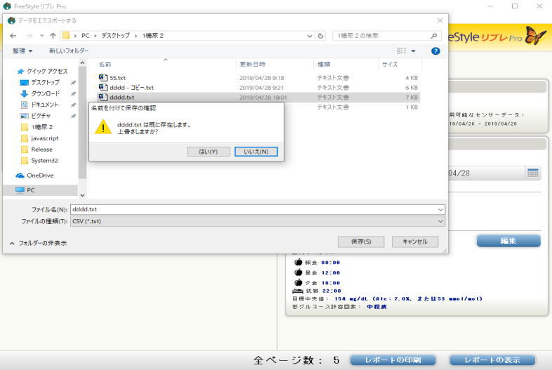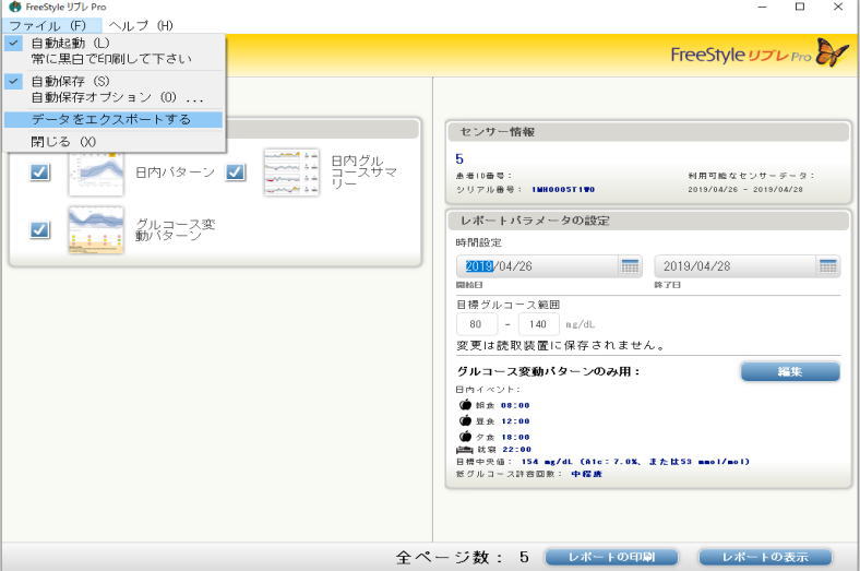 レポートの作成をクリックして名前等を入力すると先の資料が閲覧、印刷が可能となる。ここではデーターのエクスポートを見てみる。