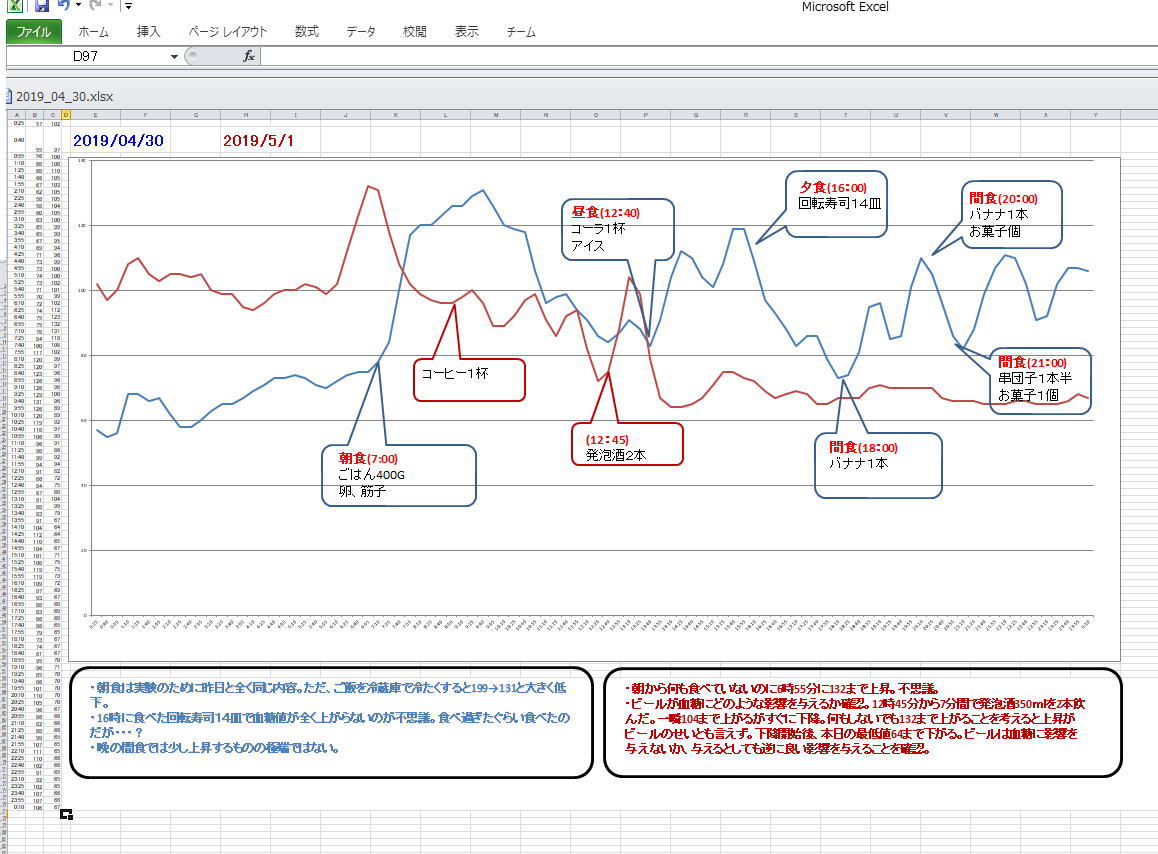 自分の場合は、このエクセルグラフに食事内容を記載して血糖値の上がり方を検証するという使い方をしている。