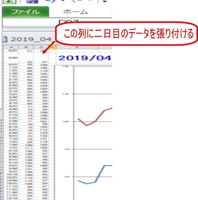 二日間を一つのグラフに表示させる方法はデータの横にもう一日分のデータを入れるだけで良い。図示すると次のようにだ。