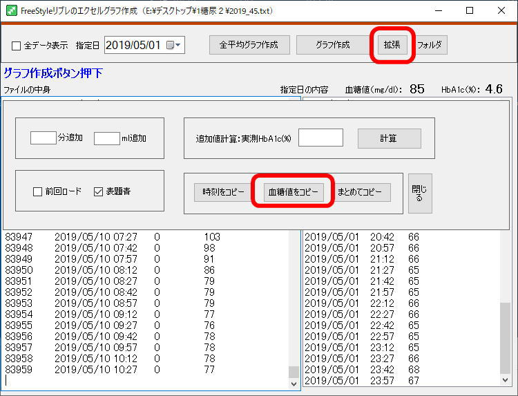 ここで、張り付けるデータを当ソフトで作成することができる。「拡張」ボタンをクリックすると「血糖値をコピー」ボタンをクリックすることができるようになる。このボタンをクリックすると指定日のエクセル用のデータをコピーするので、そのままエクセルの二日目の欄上部にペーストする。