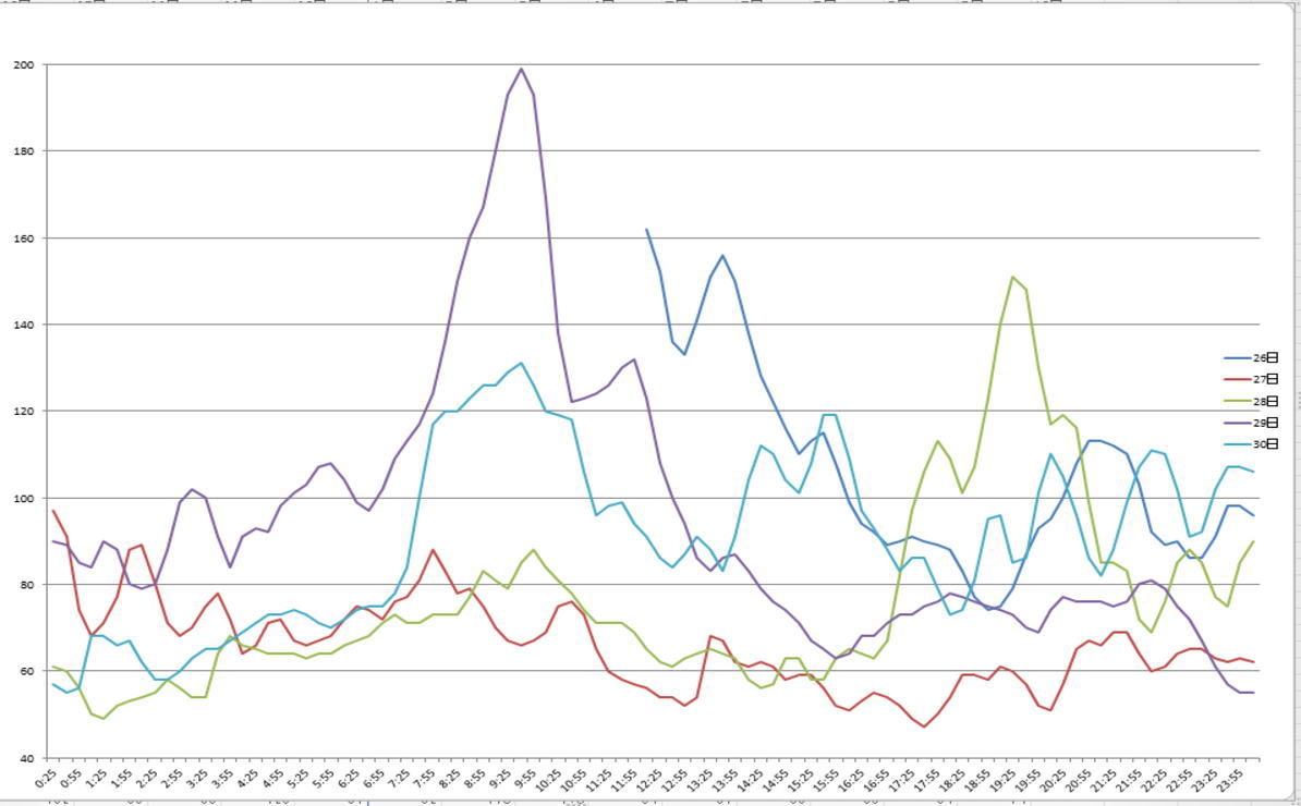 また、初日から5日間の推移は下図のとおりだ。このときは食事量が異なっているので単純には比較できないが、初日を除いて日が経つに従って上昇していることが分かる。初日は何も食べていないのに極端に高く出ていて二日目に急激に下がっている。これも着け始めは不正確というひとつの表れと思う。