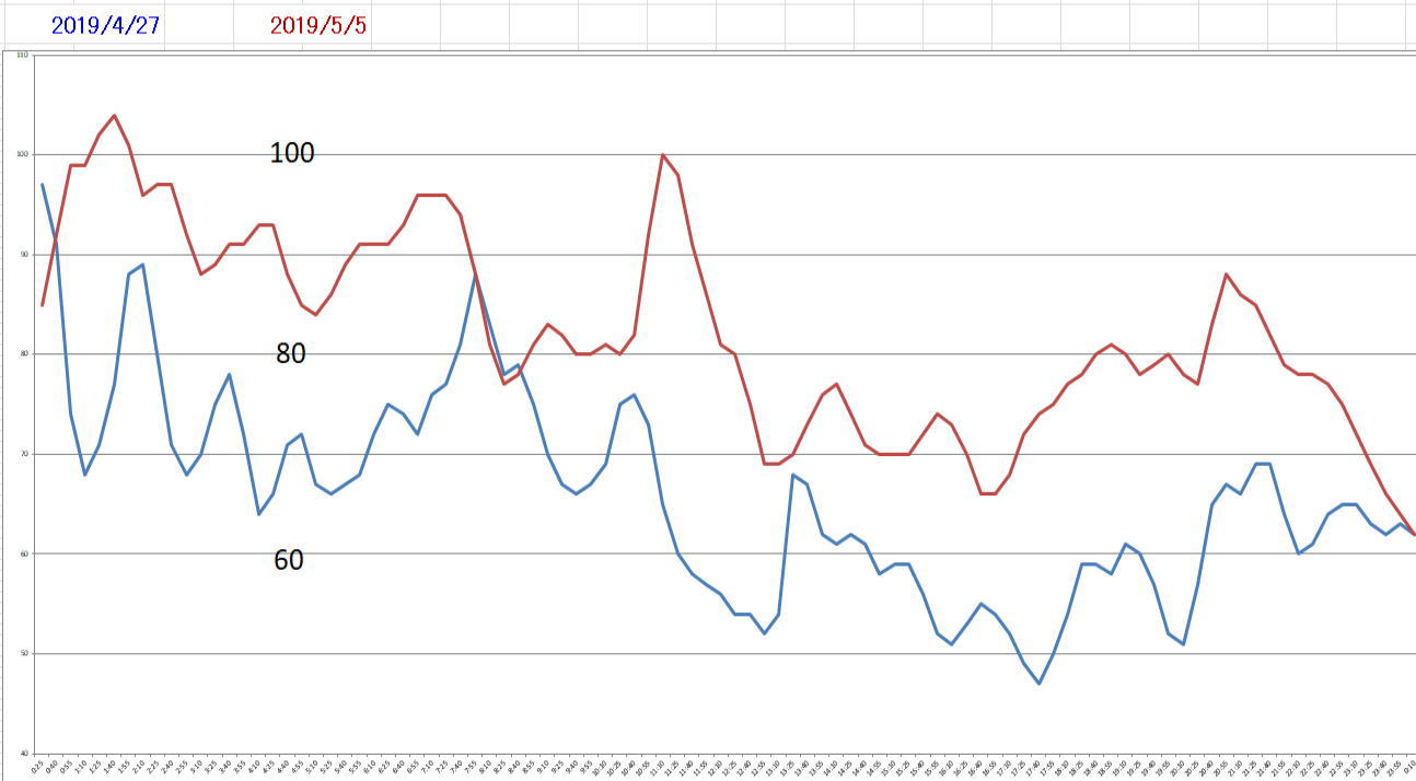 まず、実証できるのが計り始めと終わりとではどの程度の差が生じるかである。このため、センサー装着の翌日と10日目で食事を取らない状態で計測してみた。その結果は、図のとおり、10日目の方が著しく上昇している。
