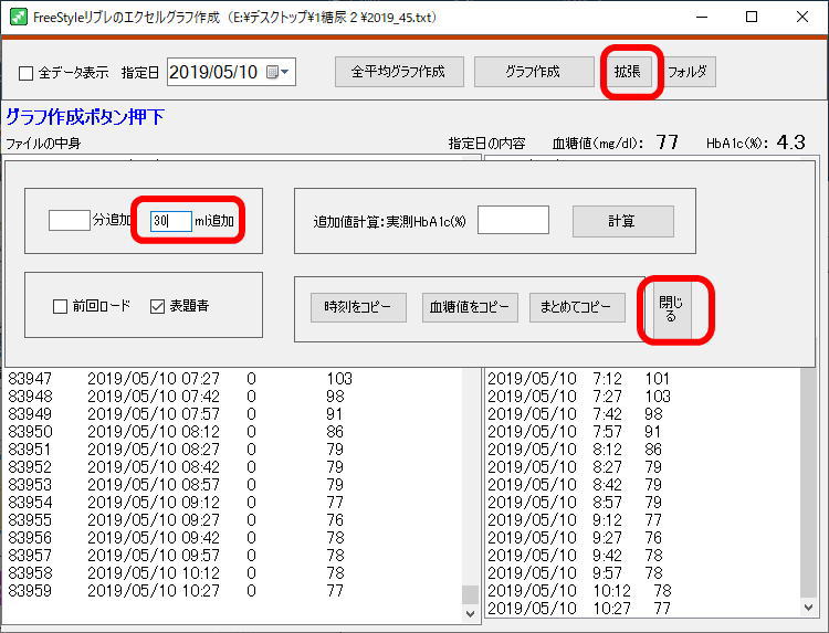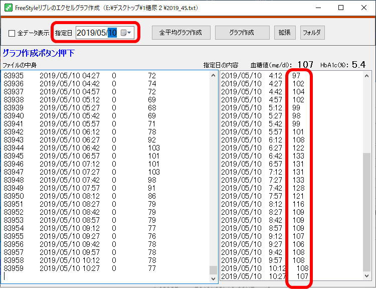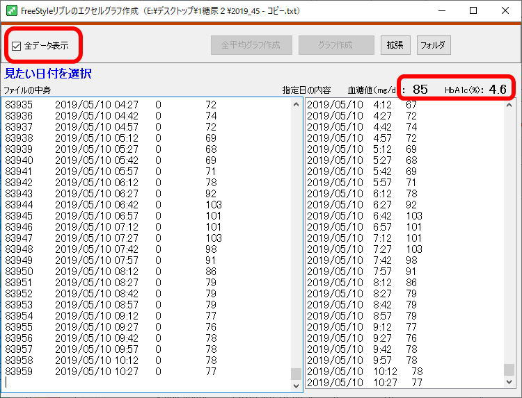 先ず、「全データ表示」をクリックし、期間内の全データの平均血糖値、推計HbA1cを右上に表示させる。