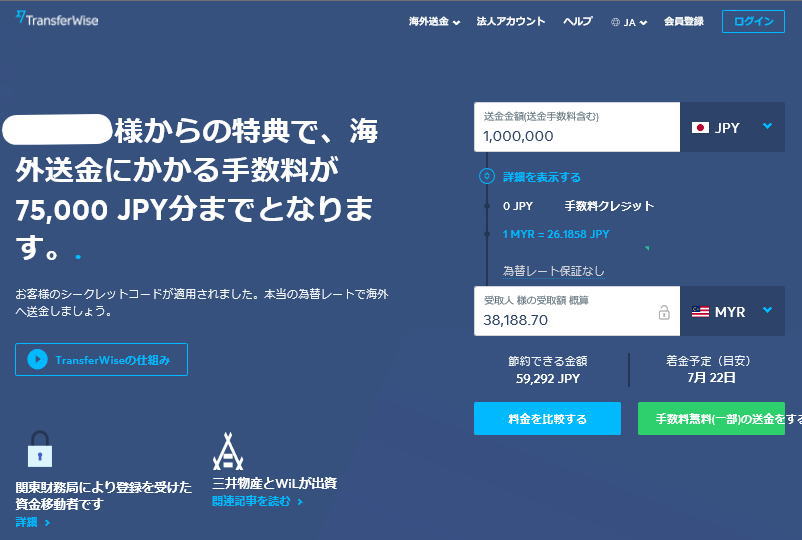 実はトランスファーワイズは紹介制度がある。こちらのリンクから初回を送金すると初回に限り手数料が無料になる。試しに、自分のアカウントからログアウトしてシミュレートしてみたのが次の画像だ。100万円の送金で着金は38,188リンギットの着金となる。私がログイン後の画面では37,802なので386リンギット、約1万円の手数料が無料となる計算だ。
