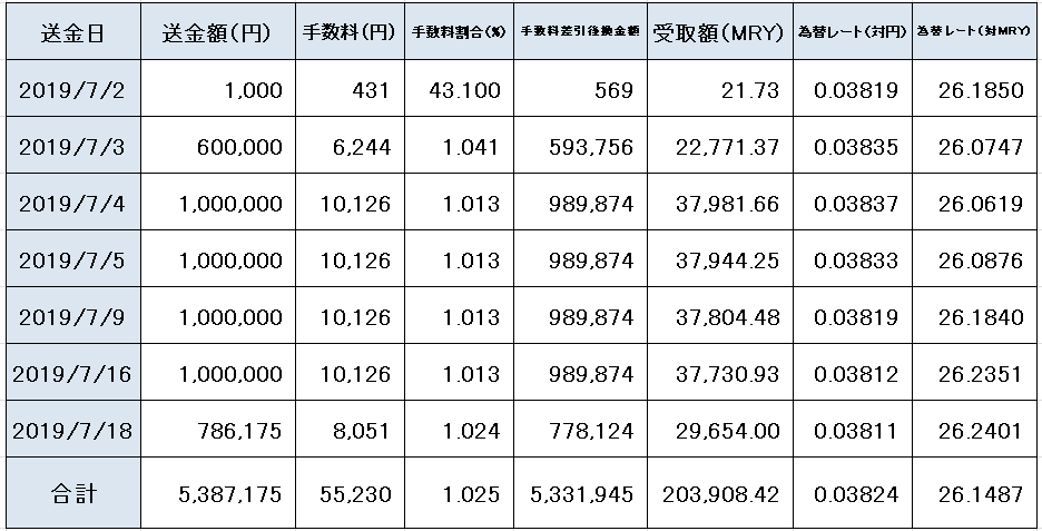 私の場合はリンギットが高くなる一方での送金だったので、同じ金額の振込みでも全体的に見るとにだんだん振り込み額が減少していることがわかる。最後の2回のときはリンギットが急に上昇したため、これでも1日の変動を見つつ最良の時点で送金したつもりだ。