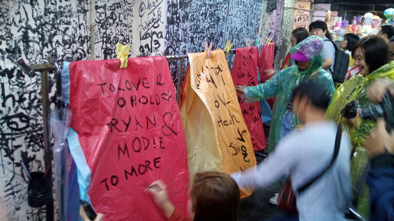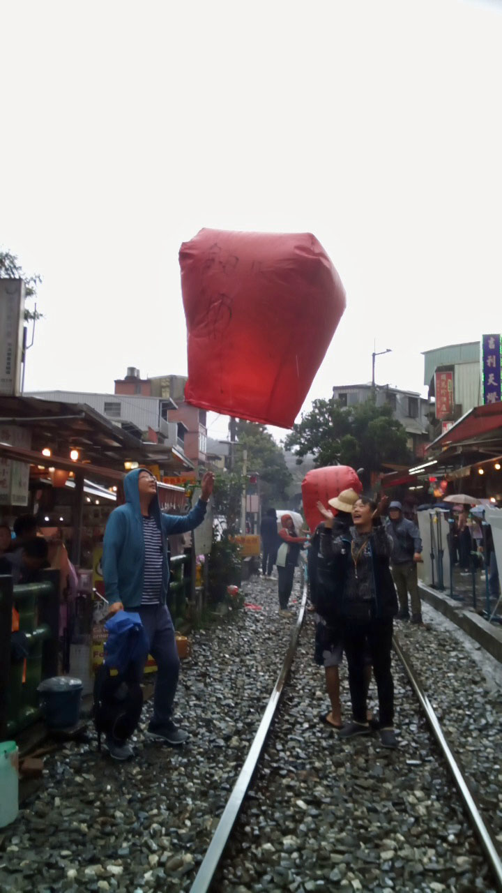 十分に着いた。線路脇で様々な店が営業をするという、観光スポット。土産物屋に連れて行かれ、ここで、先のランタンの料金を支払い、現物を渡された。皆がやっているようにクリップで留めて、表に願い事を墨で書く。